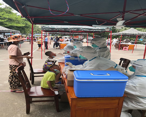 在三十几度的高温下,穿着手术衣及隔离服的白衣战士战斗在疫情最前线,从早晨到深夜一直为络绎不绝前来采样的群众进行核酸采样,即便衣服湿透,鞋里都是汗水也没有丝毫怨言,这就是我们最可爱、最可敬的白衣天使。